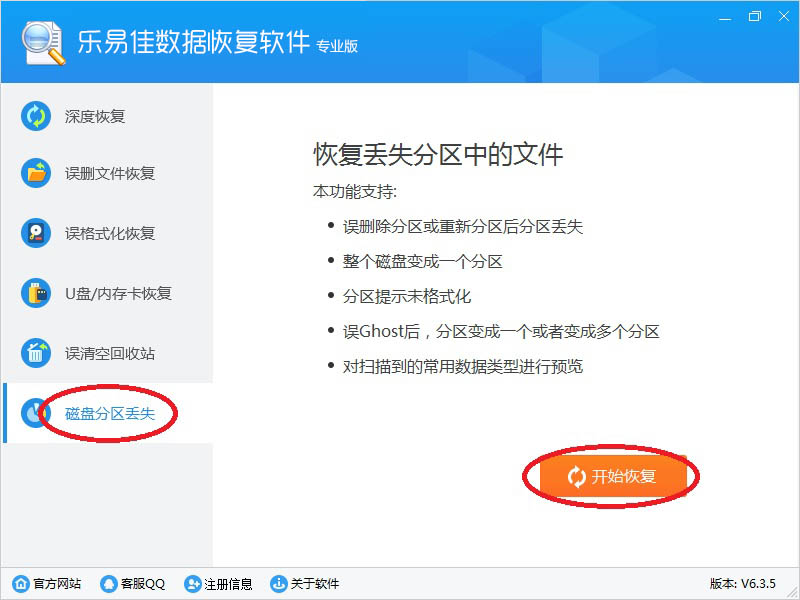 2、鼠标左键点击“磁盘分区丢失”按钮,然后再点“开始恢复”按钮。