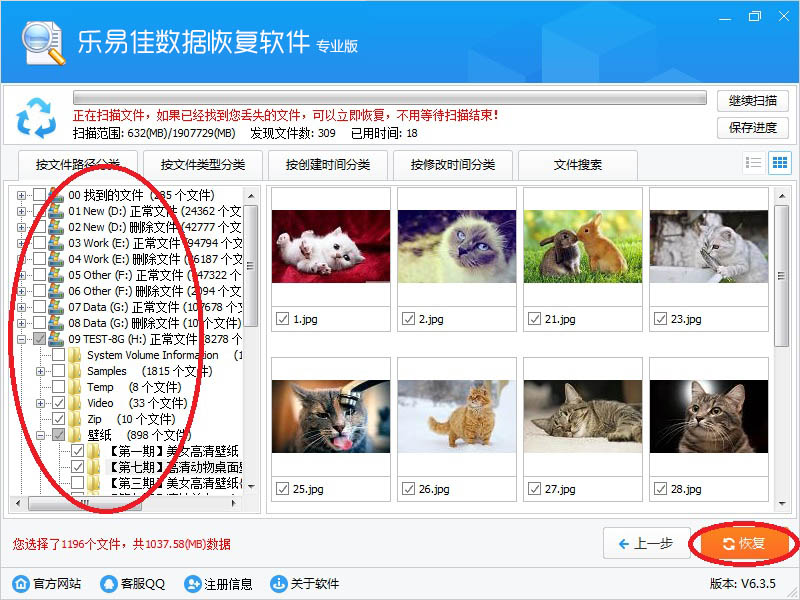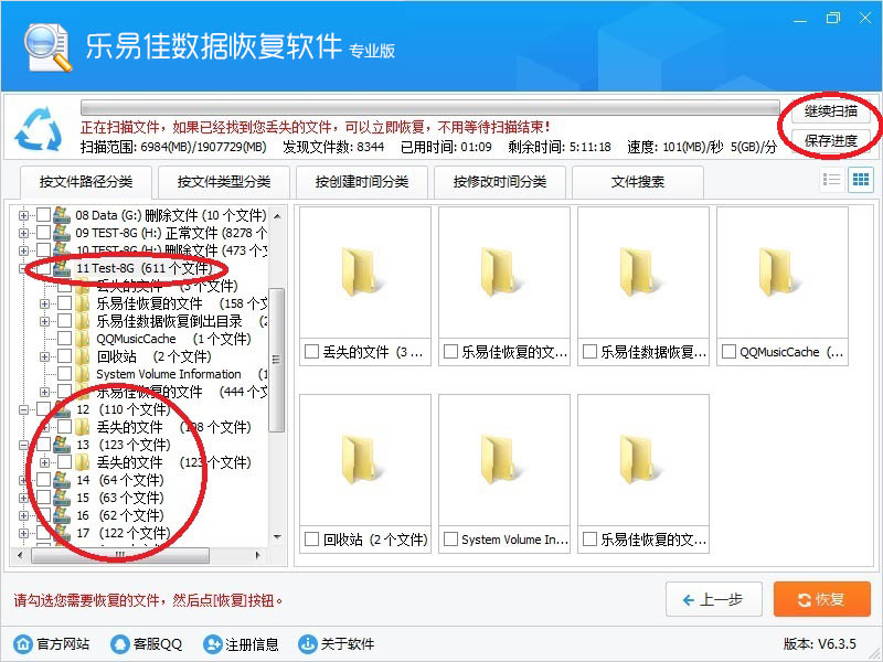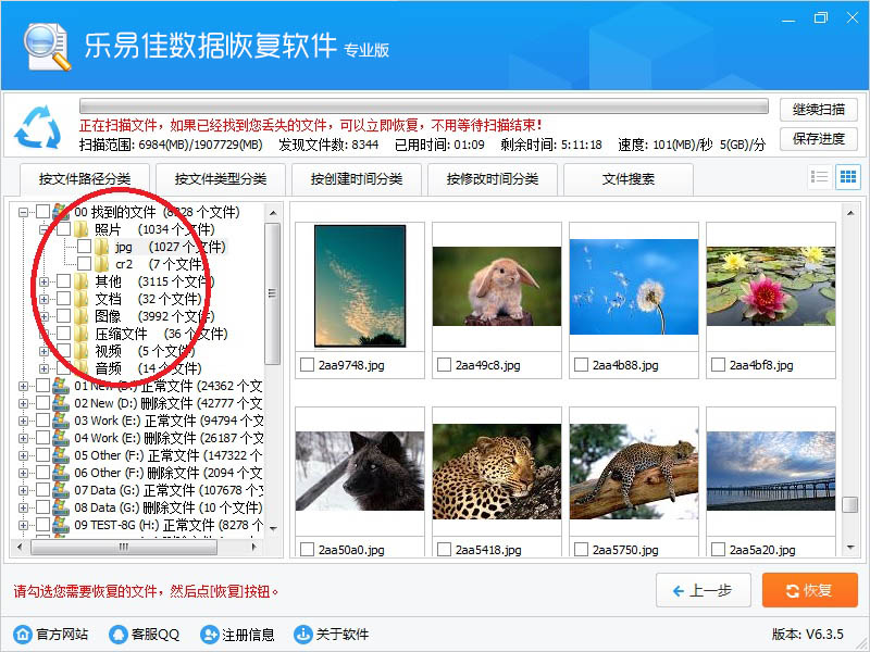 用鼠标左键点击树形控件或列表控件上的小方框,勾选需要恢复的文件,左下角显示当前勾选的文件数量。然后点右下“恢复”按钮。