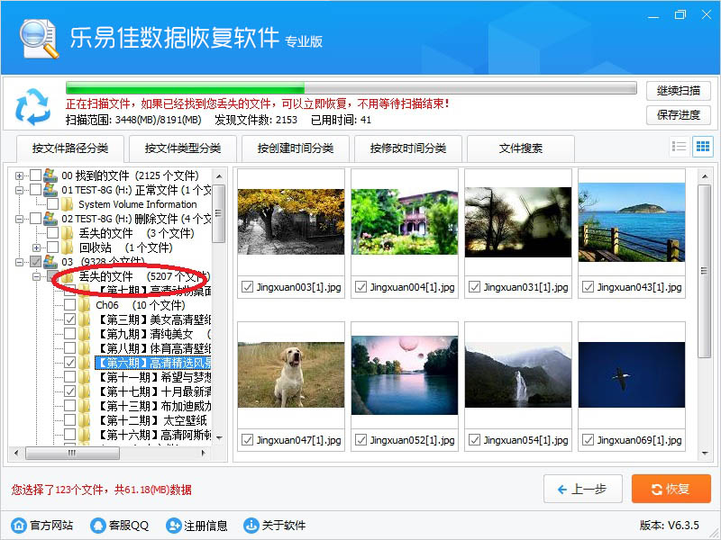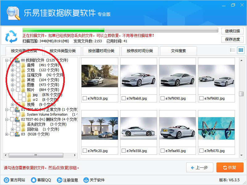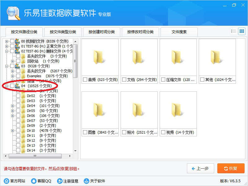 用鼠标左键点击树形控件或列表控件上的小方框,勾选需要恢复的文件,左下角显示当前勾选的文件数量。然后点右下“恢复”按钮。
