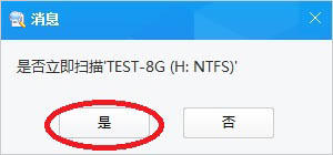 6、弹出对话框,提示“是否扫描TEST-8G(H:NTFS)”,点“是”,软件扫描H分区数据。