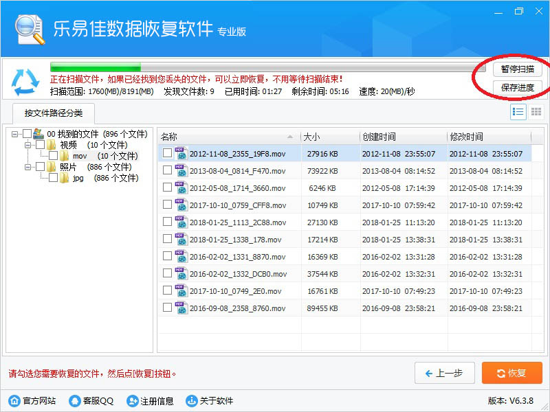 点击“保存进度”按钮,保存当前扫描到的数据,方便下次继续扫描。