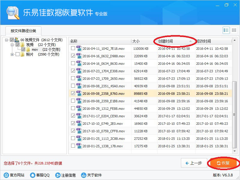 您可以点“创建时间”,视频文件就会根据视频创建视频排序,您也可以点“大小”,让文件根据大小排序,方便您找到需要恢复的视频文件。