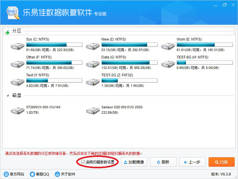 1、在设备选择界面,勾选“启用扫描参数设置”。扫描存储设备时,才会弹出参数设置对话框。