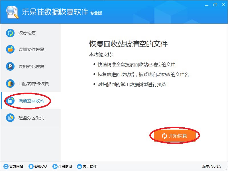 2、鼠标左键点击“误清空回收站”按钮,然后再点“开始恢复”按钮。