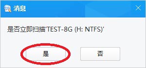 4、弹出对话框,提示“是否扫描TEST-8G(H:NTFS)”,点“是”,软件扫描H分区数据。