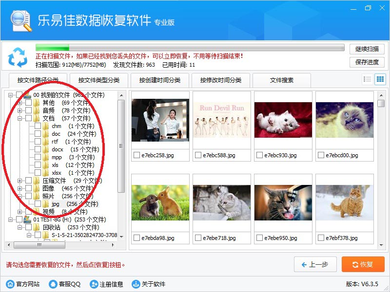 用鼠标左键点击树形控件或列表控件上的小方框,勾选需要恢复的文件,左下角显示当前勾选的文件数量。然后点右下“恢复”按钮。