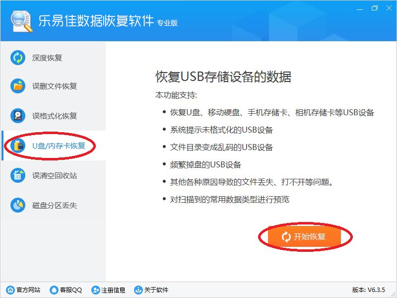 2、鼠标左键点击“U盘/内存卡恢复”按钮,然后再点“开始恢复”按钮。