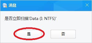 4、弹出对话框,提示“是否扫描Data(I:NTFS)”,点“是”,软件扫描I分区数据。