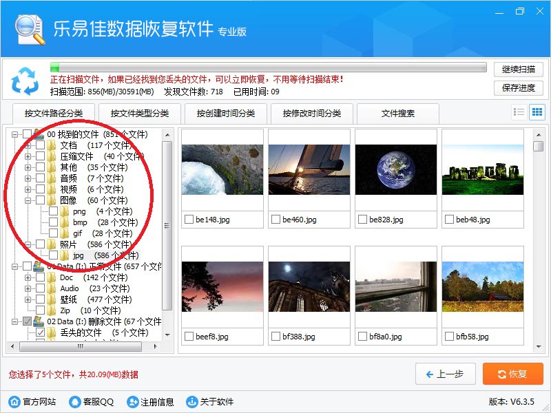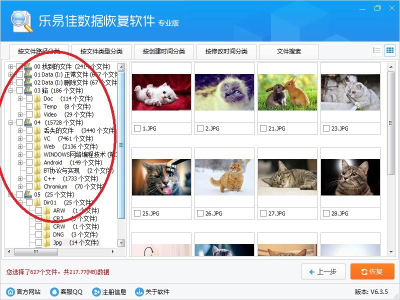 用鼠标左键点击树形控件或列表控件上的小方框,勾选需要恢复的文件,左下角显示当前勾选的文件数量。然后点右下“恢复”按钮。